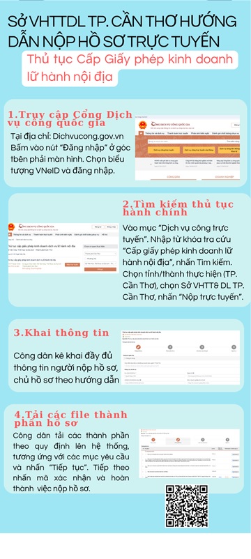 Nhằm hướng dẫn, tạo điều kiện thuận lợi người dân, doanh nghiệp trong thực hiện nộp hồ sơ trực tuyến khi có nhu cầu thủ tục hành chính. Sở Văn hóa, Thể thao và Du lịch thực hiện biên soạn, thiết kế quy trình nộp hồ sơ thủ tục hành chính (TTHC) trực tuyến thông qua hình thức Infographic đối với 08 TTHC thường xuyên phát sinh, chiếm 90% số lượng hồ sơ giải quyết TTHC của Sở: Thủ tục cấp thẻ hướng dẫn viên du lịch nội địa/ quốc tế; Thủ tục cấp đổi thẻ hướng dẫn viên du lịch nội địa/quốc tế; Thủ tục cấp giấy phép kinh doanh lữ hành nội địa; Thủ tục tiếp nhận hồ sơ thông báo sản phẩm quảng cáo trên bảng quảng cáo, băng-rôn; Thủ tục đoàn người thực hiện quảng cáo; Thủ tục biểu diễn nghệ thuật trên địa bàn quản lý; Thủ tục Cấp giấy phép đủ điều kiện kinh doanh hoạt động thể thao; Thủ tục cấp giấy phép xuất bản tài liệu không kinh doanh.