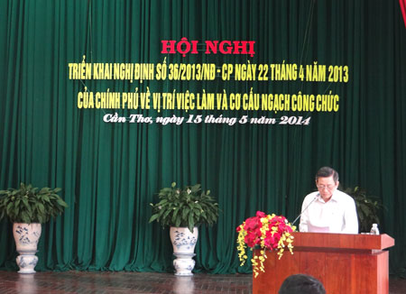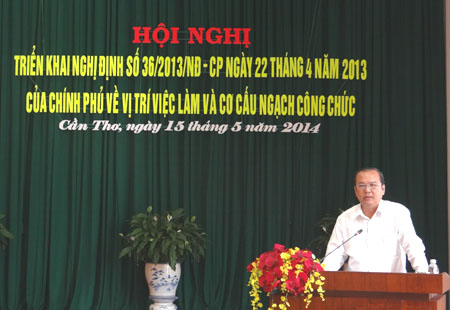 Sáng 15/5/2014, tại Hội trường Ủy ban nhân dân thành phố Cần Thơ, Sở Nội vụ tổ chức Hội nghị triển khai Nghị định số 36/2013/NĐ-CP ngày 22/4/2013 của Chính phủ về vị trí việc làm và cơ cấu ngạch công chức. Tham dự Hội nghị có ông Lê Hùng Dũng – Phó Bí thư Thành ủy, Chủ tịch Ủy ban nhân dân thành phố cùng các đại biểu là lãnh đạo các Sở, ban, ngành thành phố; lãnh đạo Ủy ban nhân dân quận, huyện và lãnh đạo Phòng Nội vụ các quận, huyện cùng dự Hội nghị.