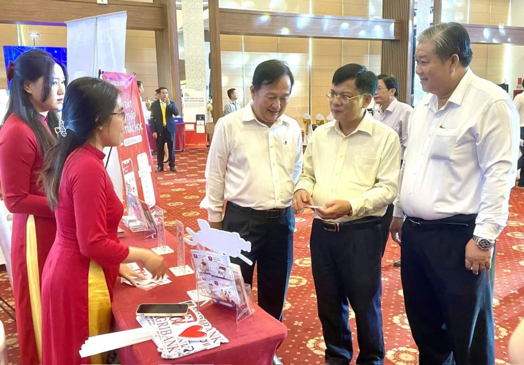 Ông Nguyễn Ngọc Hè, Phó Chủ tịch UBND TP Cần Thơ (thứ 4 từ trái sang) tham quan khu vực trưng bày của Agribank tại hội thảo.