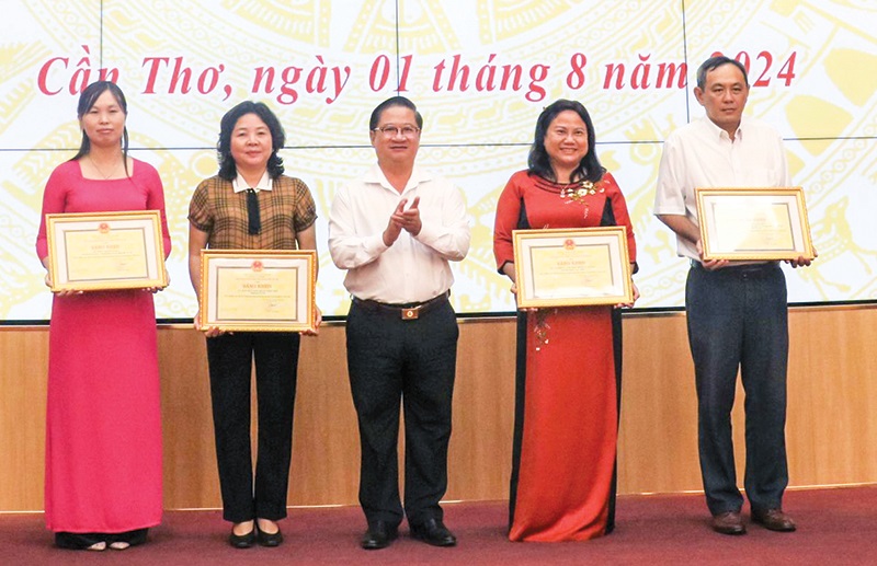 Dịp này, 2 tập thể và 2 cá nhân có thành tích xuất sắc trong phong trào thi đua CĐS năm 2023, được nhận Bằng khen của Chủ tịch UBND TP Cần Thơ. 2 tập thể (Sở Lao động - Thương binh và Xã hội, UBND quận Ninh Kiều) đạt giải Nhất cuộc thi “Đánh giá năng lực ứng dụng công nghệ thông tin, chuyển đổi số trong hoạt động quản lý, điều hành của cán bộ, công chức, viên chức lãnh đạo, quản lý” năm 2024 được tặng Bằng khen của Chủ tịch UBND TP Cần Thơ.