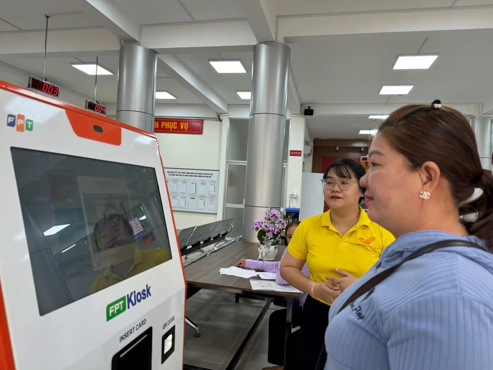 Trung tâm Phục vụ hành chính công TP Cần Thơ đã thành lập Tổ hỗ trợ thực hiện TTHC, qua đó giúp người dân thực hiện hồ sơ nhanh chóng và thuận tiện hơn. Trong ảnh: Thành viên Tổ hỗ trợ thực hiện TTHC hướng dẫn người dân xác thực thông tin bằng nhận diện khuôn mặt qua thiết bị Smart Kiosk.
