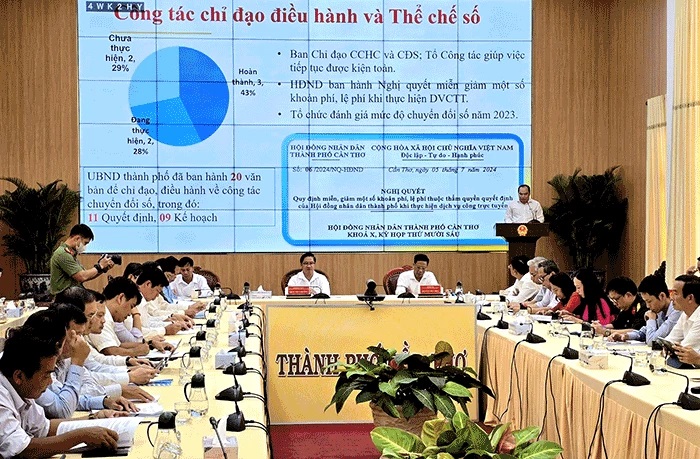 Nhóm phát triển chính quyền số có 18 nhiệm vụ (3 hoàn thành, 12 đang thực hiện, 3 chưa thực hiện); các nhóm chỉ tiêu liên quan đến giải quyết hồ sơ trực tuyến, số hóa hồ sơ thủ tục hành chính, thanh toán trực tuyến... trong 6 tháng đầu năm 2024 đều tăng so với năm 2023. Nhóm phát triển kinh tế số có 11 nhiệm vụ (5 hoàn thành, 6 đang thực hiện); thành phố có trên 600 doanh nghiệp trong lĩnh vực công nghệ thông tin, viễn thông; triển khai mô hình chợ 4.0 được 20/78 chợ truyền thống; đẩy mạnh thanh toán không dùng tiền mặt tại 13 siêu thị, 5 trung tâm thương mại và 162 cửa hàng tiện lợi; tuyên truyền các sản phẩm nông nghiệp của địa phương trên sàn thương mại điện tử; triển khai ứng dụng MobiAgri, thông tin dự báo thời tiết, tư vấn kỹ thuật sản xuất các loại cây trồng chủ lực; các hoạt động hỗ trợ phát triển thương mại điện tử của thành phố cũng quan tâm thúc đẩy… Nhóm phát triển xã hội số đẩy mạnh triển khai dịch vụ thanh toán điện tử không dùng tiền mặt: thanh toán tiền điện, tiền nước, thanh toán học phí, viện phí, các dịch vụ số trong các lĩnh vực y tế, giáo dục, thương mại, du lịch cũng từng bước phát triển; triển khai ứng dụng số di động “Can Tho Smart” tích hợp các dịch vụ số cho người dân và doanh nghiệp…