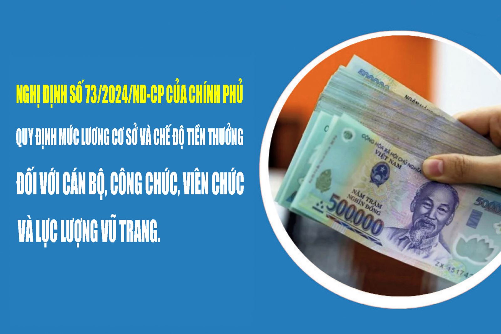 Chính phủ vừa ban hành Nghị định số 73/2024/NĐ-CP ngày 30/6/2024 quy định mức lương cơ sở và chế độ tiền thưởng đối với cán bộ, công chức, viên chức và lực lượng vũ trang. Nghị định này có hiệu lực thi hành từ ngày 01/7/2024. Dưới đây là nội dung Nghị định số 73/2024/NĐ-CP của Chính phủ.