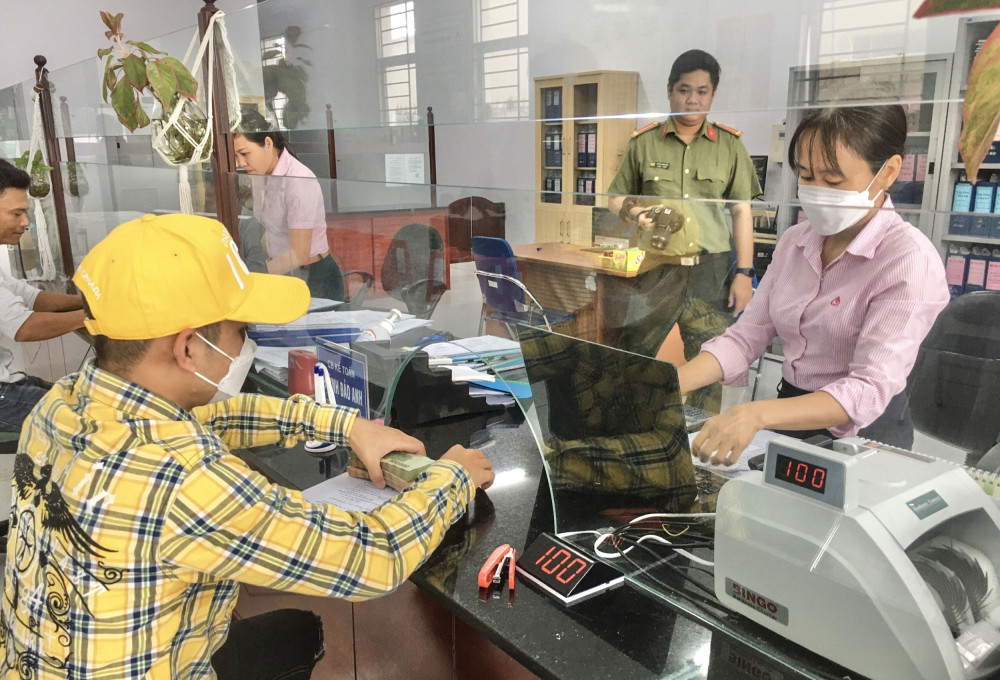 Các đối tượng đang làm thủ tục vay vốn tại Chi nhánh NHCSXH quận Cái Răng. Ảnh do Công an quận Cái Răng cung cấp.