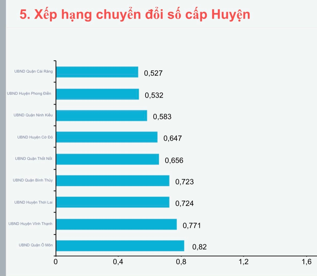 Cấp huyện có 4 đơn vị xếp loại Khá, 5 đơn vị xếp loại Trung bình. Uỷ ban nhân dân quận Ô Môn dẫn dầu với chỉ số đạt được là 82,02%. Hai quận, huyện còn lại của top 3 là Uỷ ban nhân dân huyện Vĩnh Thạnh và Uỷ ban nhân dân huyện Thới Lai với chỉ số lần lượt là 77,07% và 72,39%. Ba đơn vị thuộc nhóm cuối bảng xếp hạng là Uỷ ban nhân dân quận Ninh Kiều, Uỷ ban nhân dân huyện Phong Điền và Uỷ ban nhân dân quận Cái Răng đều có chỉ số dưới 60%, trong đó UBND quận Cái Răng có chỉ số thấp nhất với 52,73%.