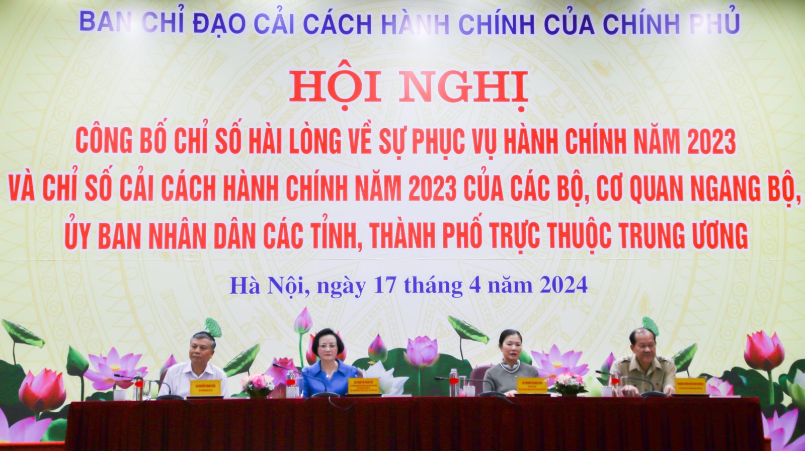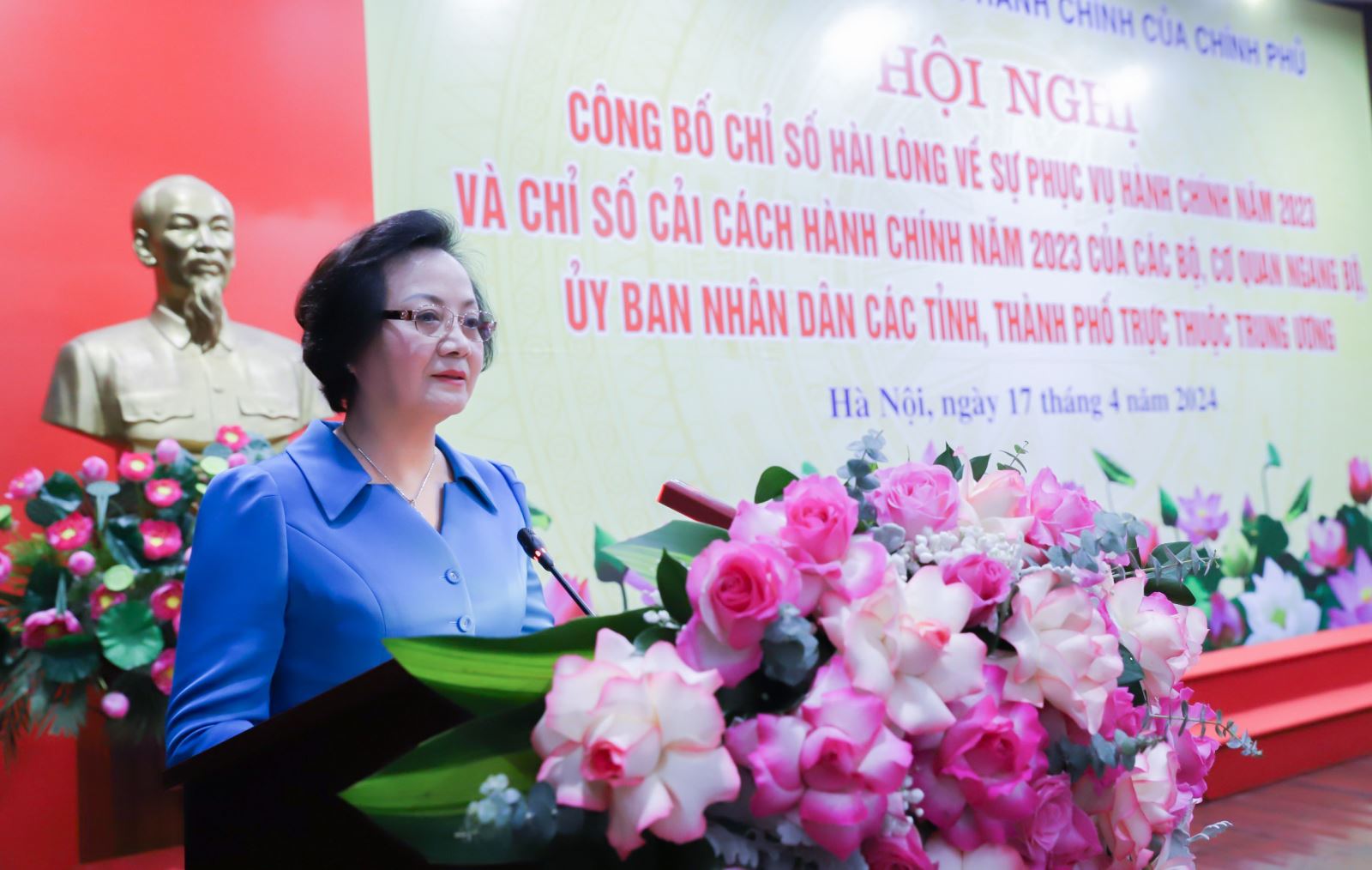 Phát biểu khai mạc Hội nghị, Bộ trưởng Bộ Nội vụ Phạm Thị Thanh Trà, Phó Trưởng ban Ban Chỉ đạo cải cách hành chính của Chính phủ cho biết, năm 2023 là năm thứ 12 liên tiếp, Bộ Nội vụ phối hợp với các bộ, ngành, địa phương và các cơ quan liên quan triển khai xác định, công bố Chỉ số cải cách hành chính của các bộ, các tỉnh; là năm thứ 7 triển khai đo lường sự hài lòng của người dân, tổ chức đối với sự phục vụ của cơ quan hành chính tại 63 tỉnh, thành phố trên cả nước. Quá trình triển khai nghiêm túc, khoa học, dân chủ, có sự phối hợp chặt chẽ giữa Bộ Nội vụ và các bộ, ngành, địa phương, đặc biệt là sự phối hợp, hỗ trợ của Ban Thường trực Ủy ban Trung ương Mặt trận Tổ quốc Việt Nam, Trung ương Hội Cựu chiến binh Việt Nam và Tổng Công ty Bưu điện Việt Nam trong tổ chức triển khai điều tra xã hội học, quy mô lớn với gần 90.000 mẫu, để lấy ý kiến đánh giá của công chức, người dân về kết quả cải cách hành chính của các bộ, các tỉnh; đồng thời, để đo lường mức độ hài lòng của người dân đối với sự phục vụ của cơ quan hành chính nhà nước.