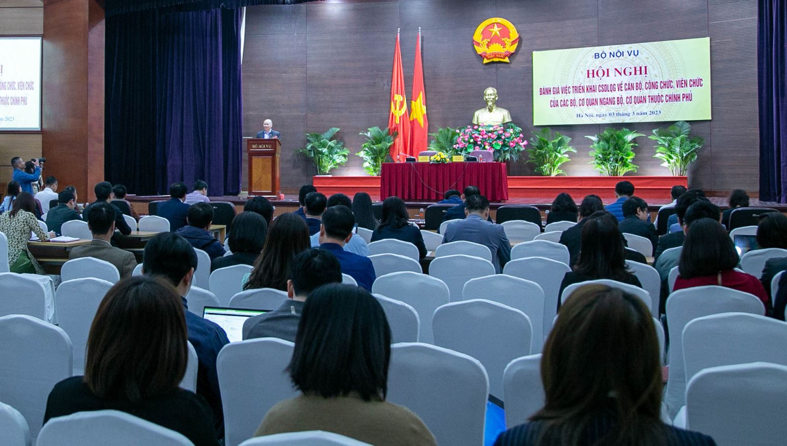 Thực hiện Quyết định số 893/QĐ-TTg ngày 25/6/2020 của Thủ tướng Chính phủ phê duyệt Đề án xây dựng Cơ sở dữ liệu quốc gia về cán bộ, công chức, viên chức trong các cơ quan nhà nước và Quyết định số 06/QĐ-TTg ngày 06/01/2022 phê duyệt Đề án phát triển ứng dụng dữ liệu dân cư, định danh và xác thực điện tử phục vụ chuyển đổi số quốc gia giai đoạn 2022 - 2025, tầm nhìn đến năm 2030 (Đề án 06/CP), sáng ngày 03/3/2023, Bộ Nội vụ tổ chức Hội nghị đánh giá triển khai Cơ sở dữ liệu quốc gia (CSDLQG) về cán bộ, công chức, viên chức (CBCCVC) của các bộ, cơ quan ngang Bộ, cơ quan thuộc Chính phủ.