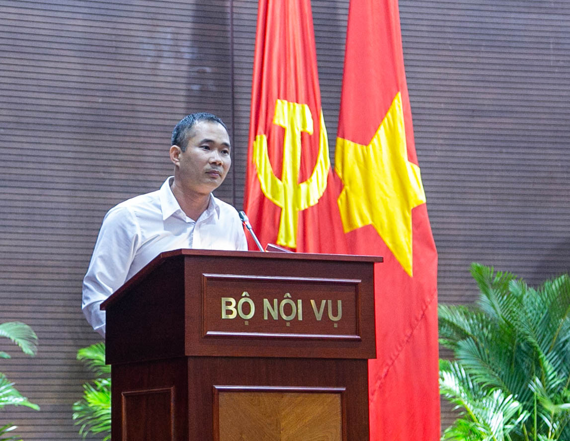 Ông Đỗ Ngọc Vĩnh, Phó Giám đốc Trung tâm Công nghệ số quốc gia, Cục Chuyển đổi số quốc gia, Bộ Thông tin và Truyền thông (cán bộ biệt phái làm việc tại Bộ Nội vụ) trình bày hướng dẫn cập nhật dữ liệu, xác thực thông tin về CBCCVC để kết nối, chia sẻ dữ liệu với CSDLQG.