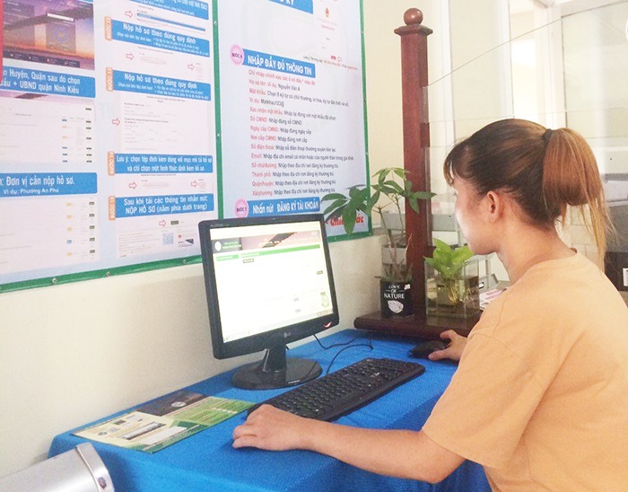 Người dân sử dụng máy vi tính thực hiện DVCTT tại Bộ phận Một cửa UBND phường An Phú, quận Ninh Kiều.