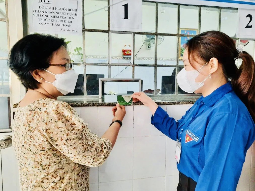 Đoàn viên, thanh niên Bệnh viện Đa khoa quận Ô Môn hướng dẫn người dân thanh toán viện phí qua thẻ ngân hàng.