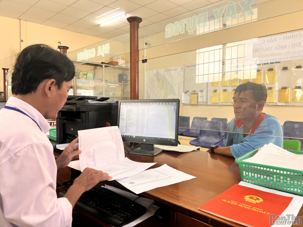 Người sử dụng đất thực hiện thủ tục đăng ký chuyển nhượng quyền sử dụng đất tại Bộ phận Một cửa UBND phường Tân Hưng, quận Thốt Nốt.