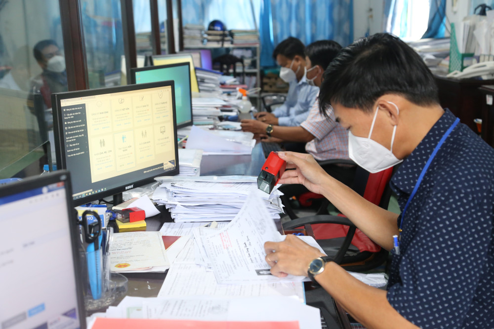 Công chức Tư pháp - Hộ tịch thị trấn Thới Lai giải quyết hồ sơ hành chính cho người dân. Ảnh: S.H