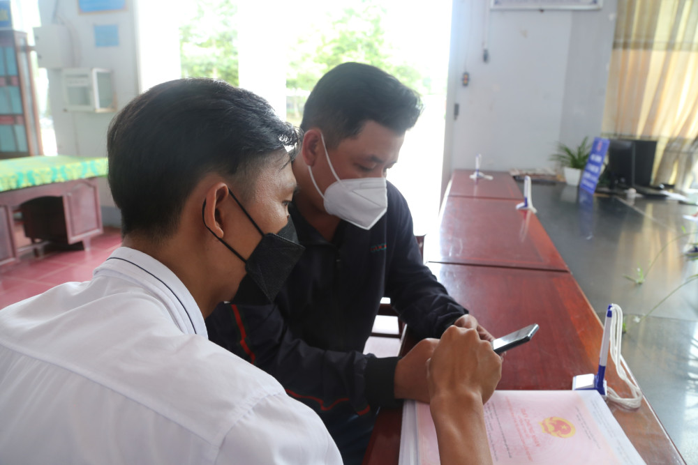 Công chức UBND phường Thới Hòa, quận Ô Môn hướng dẫn người dân thao tác đăng ký tài khoản trên Cổng dịch vụ công trực tuyến. Ảnh: S.H