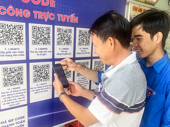Đoàn viên phường Long Hưng, quận Ô Môn, hướng dẫn người dân quét mã QR thực hiện thủ tục hành chính. Ảnh: CTV