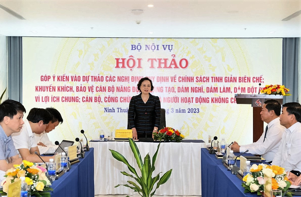 Ngày 27/3, tại tỉnh Ninh Thuận, Bộ Nội vụ tổ chức Hội thảo lấy ý kiến góp ý vào dự thảo các nghị định quy định về chính sách tinh giản biên chế; khuyến khích, bảo vệ cán bộ năng động, sáng tạo, dám nghĩ, dám làm, dám đột phá vì lợi ích chung; cán bộ, công chức cấp xã và người hoạt động không chuyên trách ở cấp xã, ở thôn, tổ dân phố. Bộ trưởng Phạm Thị Thanh Trà chủ trì hội thảo.