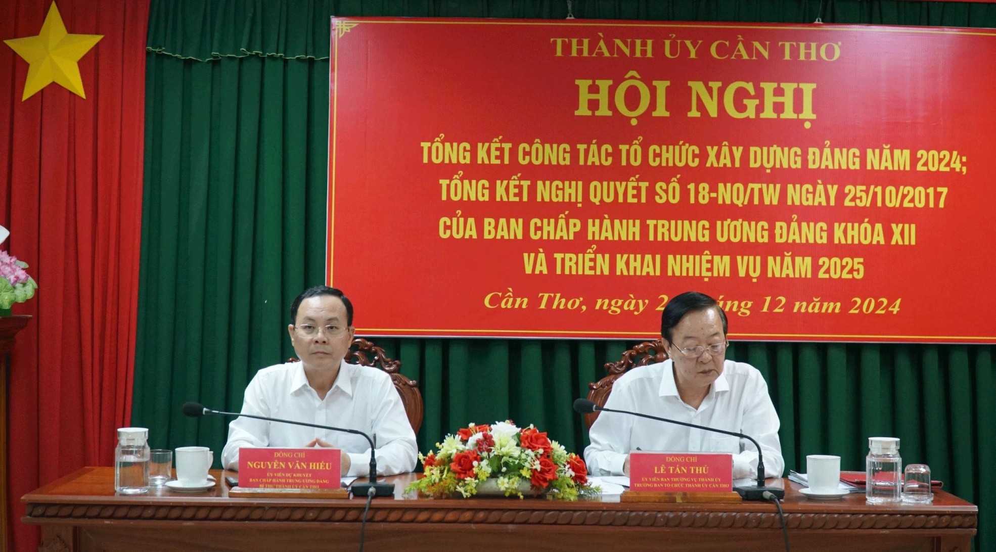 (CT) - Sáng 26-12, Ban Thường vụ (BTV) Thành ủy Cần Thơ tổ chức hội nghị tổng kết công tác tổ chức xây dựng Đảng năm 2024, triển khai nhiệm vụ công tác năm 2025 và tổng kết thực hiện Nghị quyết số 18-NQ/TW ngày 25-10-2017 của Ban Chấp hành Trung ương Đảng khóa XII “Một số vấn đề về tiếp tục đổi mới, sắp xếp tổ chức bộ máy của hệ thống chính trị tinh gọn, hoạt động hiệu lực, hiệu quả” (Nghị quyết số 18-NQ/TW).