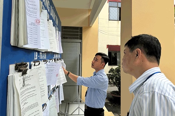 Thành viên Tổ giúp việc đoàn kiểm tra CCHC thành phố kiểm tra việc niêm yết các nội dung công khai dân chủ cơ sở theo quy định tại UBND phường Long Hòa, quận Bình Thủy.