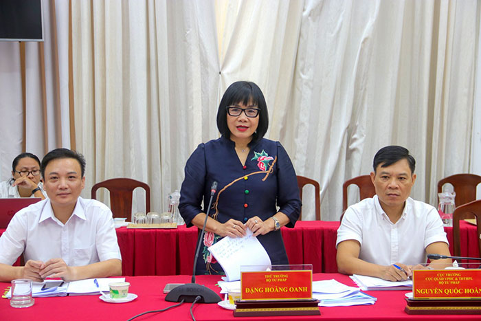 Thứ trưởng Bộ Tư pháp Ðặng Hoàng Oanh trao đổi với UBND thành phố về công tác theo dõi thi hành pháp luật trong lĩnh vực trọng tâm, liên ngành.