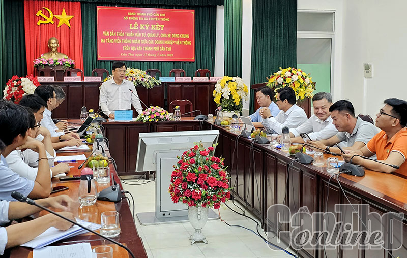 (CT) - Chiều 17-7, Sở Thông tin và Truyền thông (TTTT) TP Cần Thơ tổ chức Lễ ký kết văn bản thỏa thuận đầu tư, quản lý, chia sẻ dùng chung hạ tầng viễn thông ngầm giữa các doanh nghiệp viễn thông trên địa bàn TP Cần Thơ và trao đổi việc thực hiện một số nhiệm vụ trọng tâm lĩnh vực TTTT trong năm 2023.