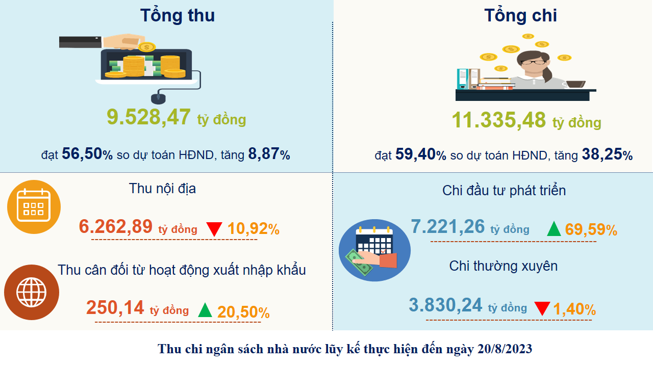 Tổng thu ngân sách nhà nước lũy kế thực hiện đến ngày 20 tháng 8 năm 2023 đạt 9.528,47 tỷ đồng, bằng 56,50% dự toán HĐND thành phố giao, tăng 8,87% so với cùng kỳ.
