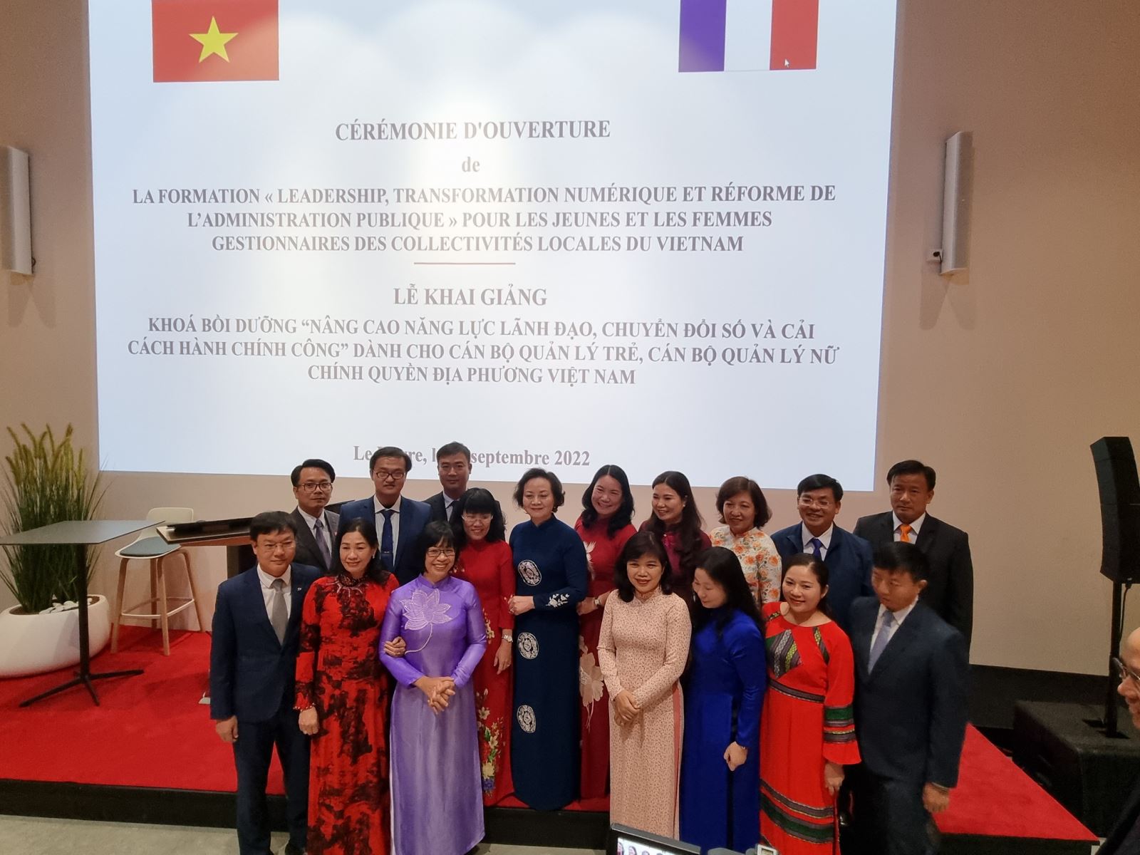 Lễ khai giảng khóa bồi dưỡng "Nâng cao năng lực lãnh đạo, chuyển đổi số và cải cách hành chính công" dành cho cán bộ quản lý trẻ, cán bộ quản lý nữ chính quyền địa phương Việt Nam tại Trường Quản trị Normandie (thành phố Le Havre, Cộng hòa Pháp), ngày 26/9/2022. Ảnh minh họa