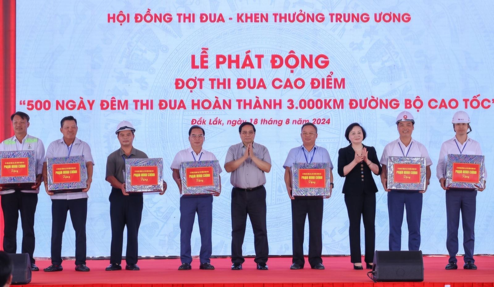 Thủ tướng Chính phủ Phạm Minh Chính, Chủ tịch Hội đồng Thi đua - Khen thưởng Trung ương và Bộ trưởng Bộ Nội vụ Phạm Thị Thanh Trà, Phó Chủ tịch Thường trực Hội đồng Thi đua - Khen thưởng Trung ương trao quà cho các đơn vị thi công, nhà thầu tại Lễ phát động Đợt thi đua cao điểm "500 ngày đêm thi đua hoàn thành 3.000 km đường bộ cao tốc". |