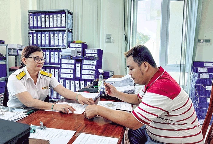 Cán bộ Chi cục Thuế khu vực Bình Thủy - Ô Môn hướng dẫn người dân thực hiện thủ tục về thuế tại bộ phận một cửa.
