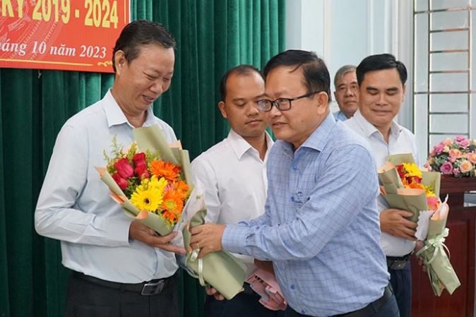 Ðồng chí Nguyễn Trung Nhân, Chủ tịch Ủy ban MTTQVN TP Cần Thơ, tặng hoa chúc mừng ông Nguyễn Văn Chung vừa được bầu làm Chủ tịch Ủy ban MTTQVN quận Ô Môn.