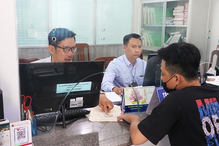 Người dân thực hiện thủ tục hành chính tại Bộ phận Một cửa UBND phường Thới Long, quận Ô Môn.