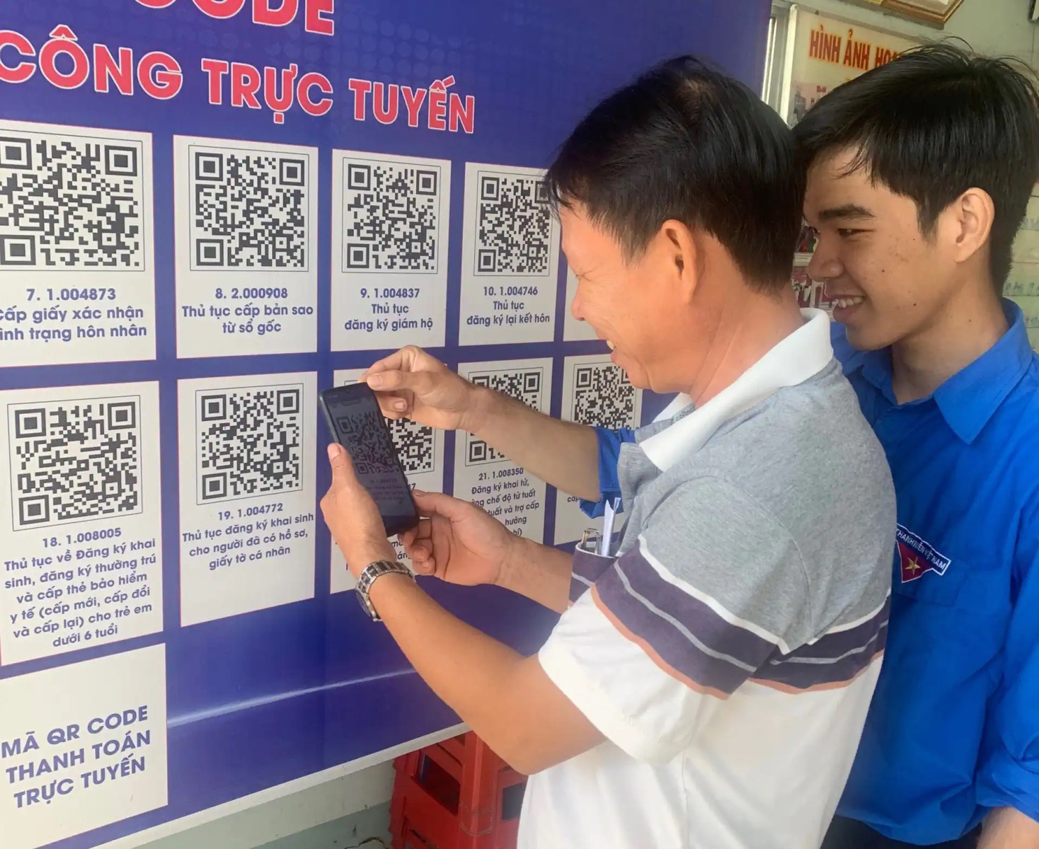 Đoàn viên phường Long Hưng hướng dẫn người dân quét mã QR để thực hiện thủ tục hành chính.