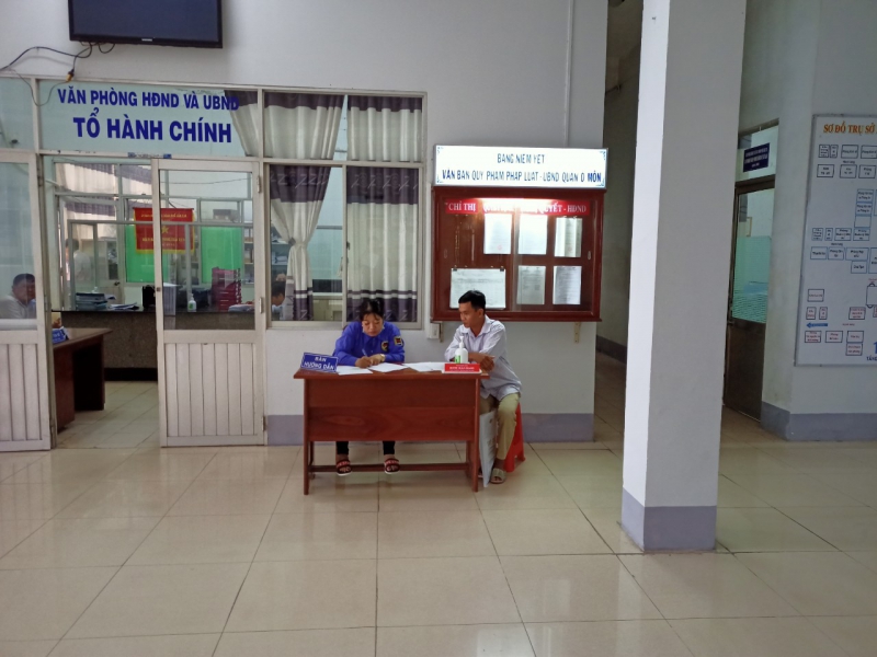 Nhân viên bảo vệ Văn phòng UBND quận Ô Môn hướng dẫn người dân ghi hồ sơ thủ tục hành chính