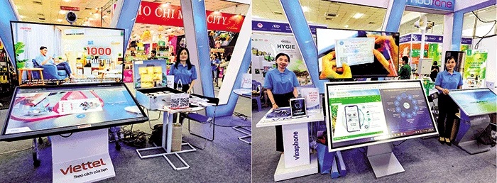 Thời gian qua, các tập đoàn viễn thông như Viettel và Vinaphone luôn đồng hành, hỗ trợ TP Cần Thơ thực hiện các giải pháp CÐS hiệu quả. Trong ảnh: Viettel và Vinaphone giới thiệu giải pháp CÐS tại Hội chợ, triển lãm “Thành phố Cần Thơ - 20 năm thành tựu và phát triển”.