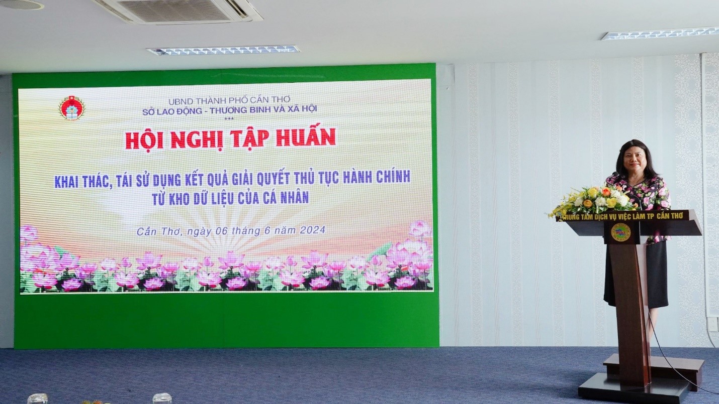 Chiều ngày 06/06/2024, tại Trung tâm Dịch vụ việc làm thành phố Cần Thơ, Sở Lao động - Thương binh và Xã hội tổ chức “Hội nghị tập huấn khai thác, tái sử dụng kết quả giải quyết thủ tục hành chính từ kho dữ liệu cá nhân”. Bà Trần Thị Xuân Mai, Ủy viên Ủy ban nhân dân thành phố Cần Thơ, Giám đốc Sở Lao động - Thương binh và Xã hội dự, chủ trì và phát biểu chỉ đạo tại Hội nghị.
