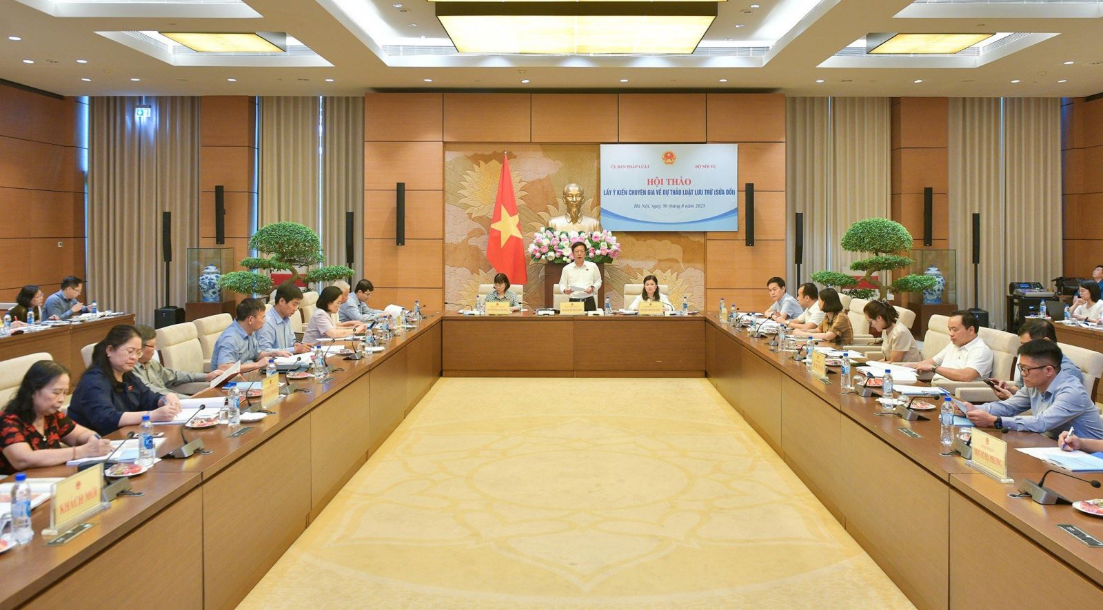 Chiều 30/8/2023, tại Hà Nội, Ủy ban Pháp luật của Quốc hội phối hợp với Bộ Nội vụ tổ chức Hội thảo lấy ý kiến chuyên gia về dự thảo Luật Lưu trữ (sửa đổi). Các Phó Chủ nhiệm Ủy ban Pháp luật của Quốc hội Nguyễn Trường Giang, Nguyễn Thị Mai Phương, Nguyễn Phương Thủy chủ trì Hội thảo. Cùng dự có đại diện Hội đồng Dân tộc và một số Ủy ban của Quốc hội, lãnh đạo Cục Văn thư và Lưu trữ nhà nước (Bộ Nội vụ), đại diện các cơ quan, tổ chức có liên quan ở Trung ương và địa phương, chuyên gia trong lĩnh vực lưu trữ…