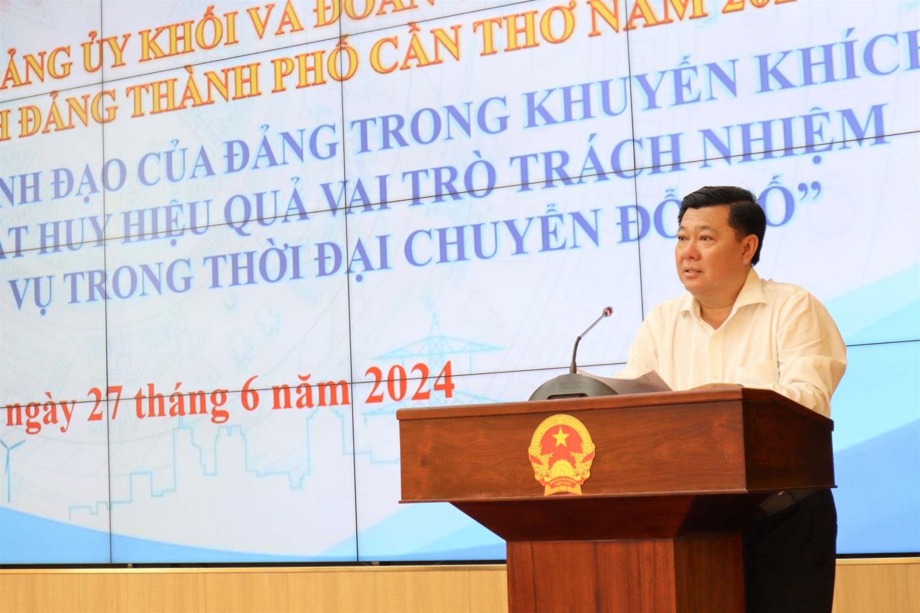Đồng chí Hồ Truyền Thống, Phó Bí thư Thường trực Đảng ủy Khối cơ quan Dân Chính Đảng thành phố Cần Thơ phát biểu tại Hội nghị