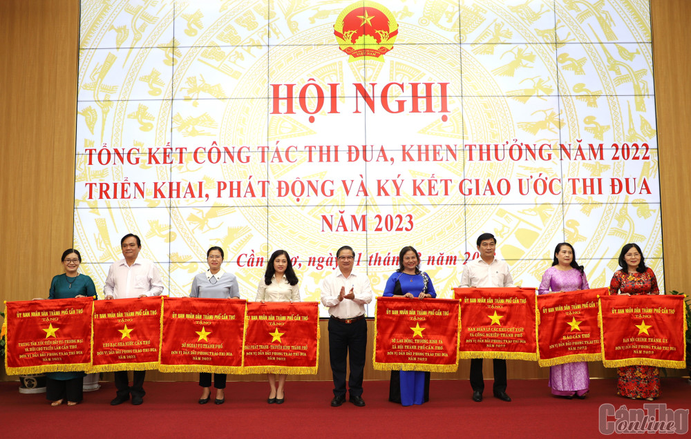 Đồng chí Trần Việt Trường, Phó Bí thư Thành ủy, Chủ tịch UBND, Chủ tịch Hội đồng TĐKT TP Cần Thơ tặng Cờ thi đua cho các tập thể dẫn đầu phong trào thi đua năm 2022.