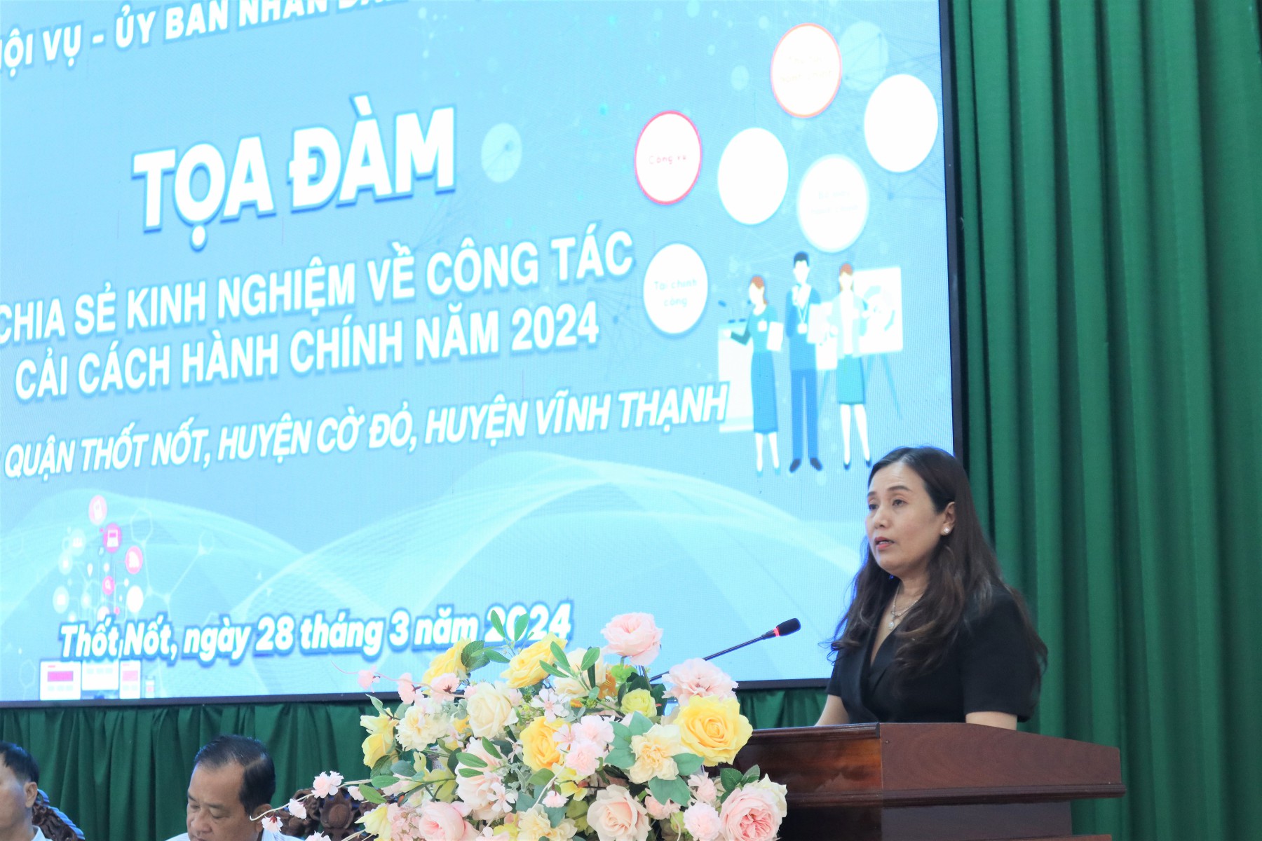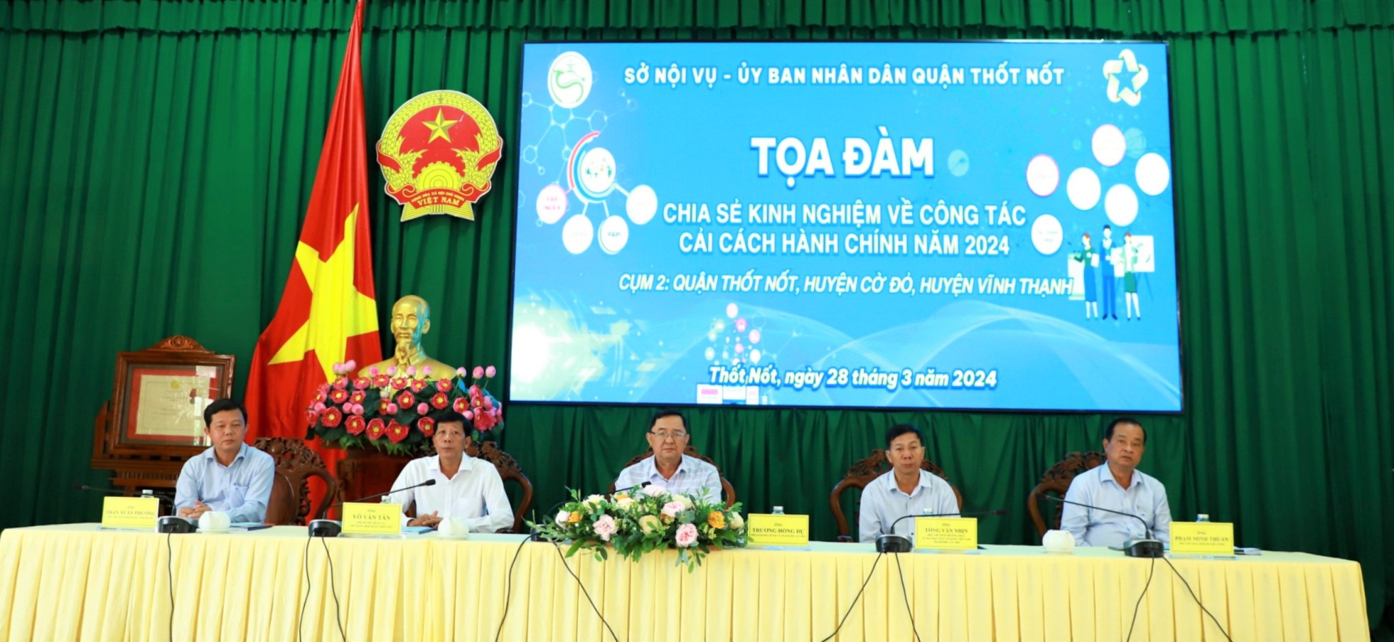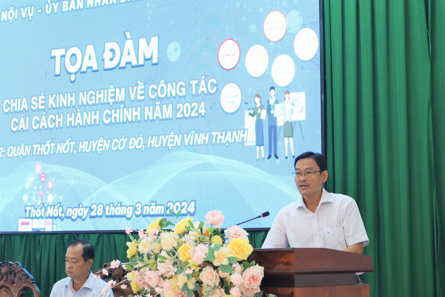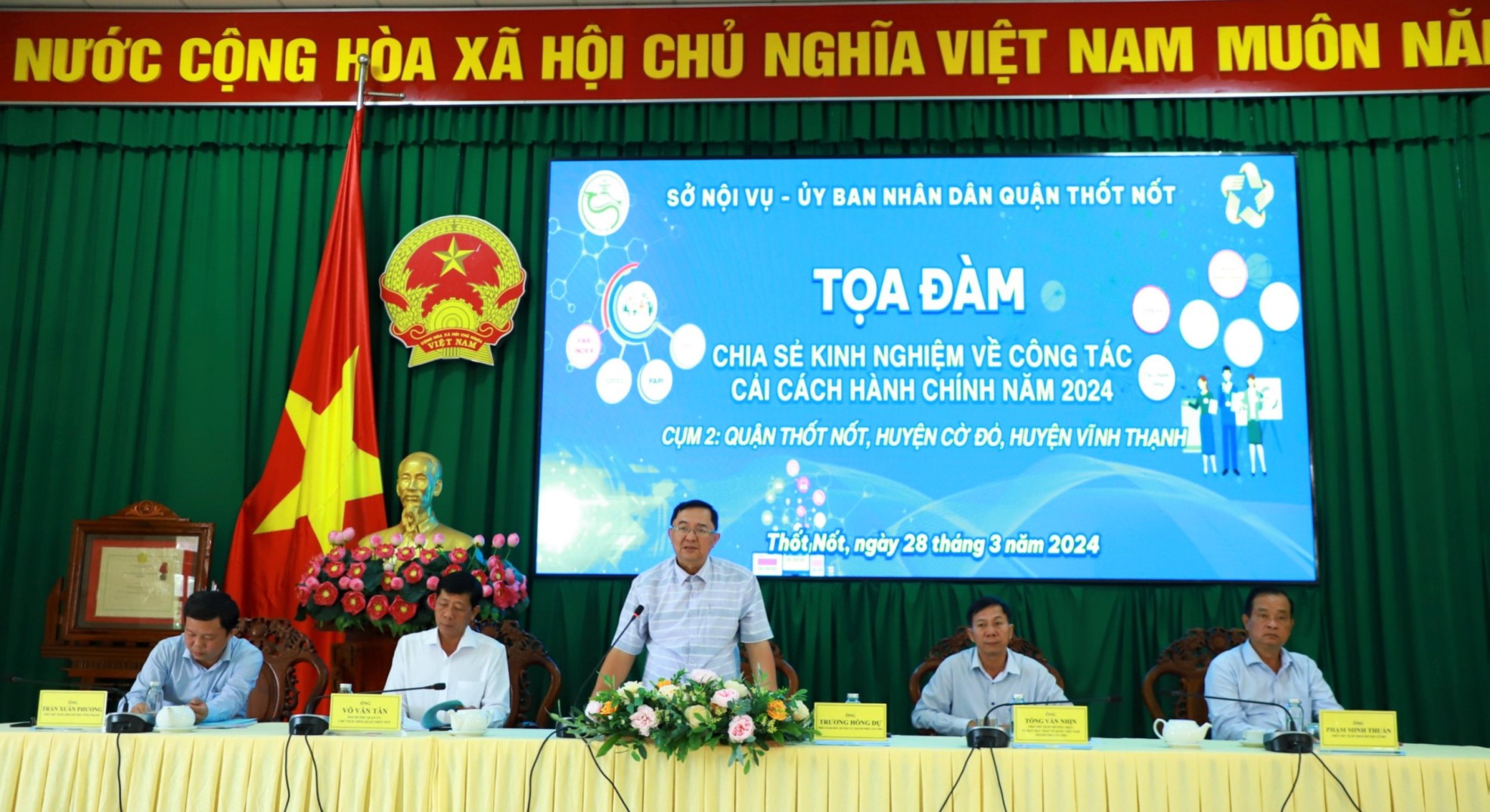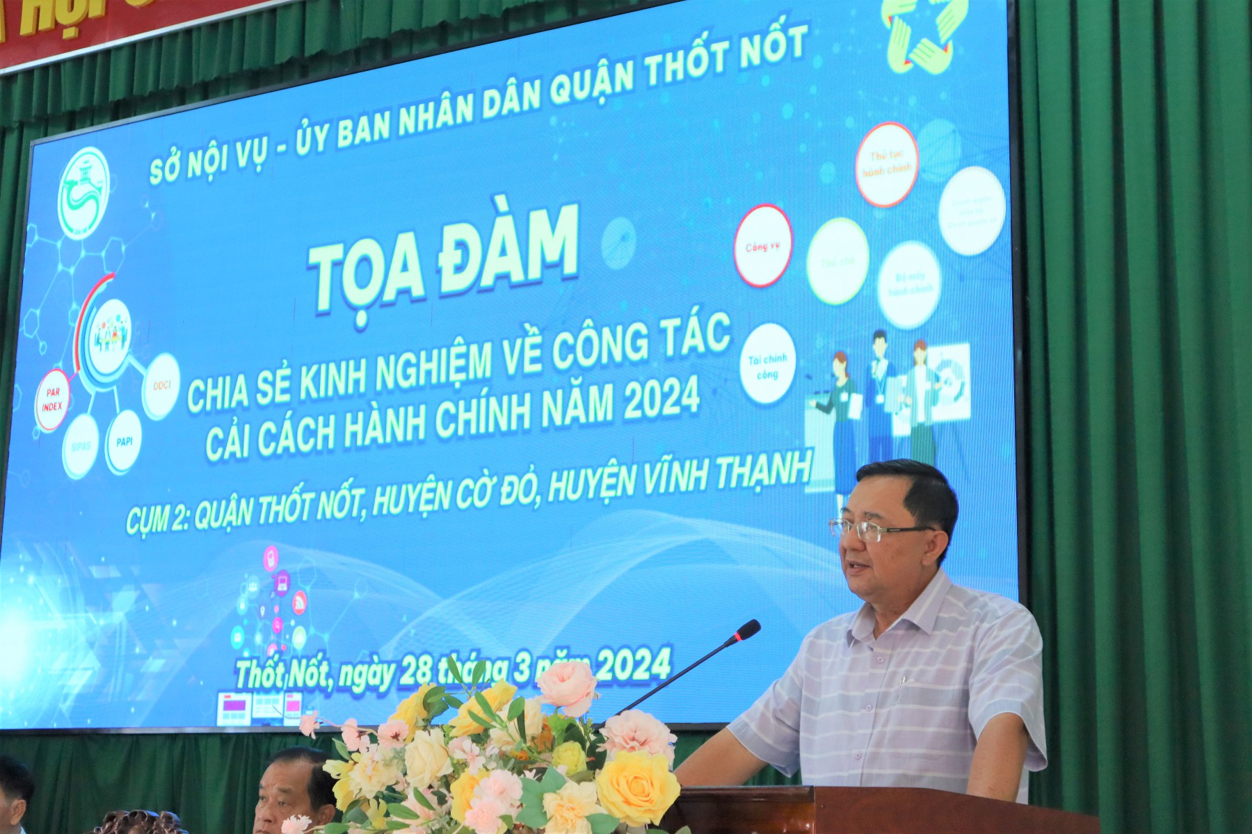 Chiều ngày 28/3/2024, Sở Nội vụ thành phố Cần Thơ cùng với UBND quận Thốt Nốt phối hợp tổ chức tọa đàm chia sẻ kinh nghiệm về công tác Cải cách hành chính (CCHC) cụm số 02 với 03 quận, huyện là quận Thốt Nốt, huyện Cờ Đỏ và huyện Vĩnh Thạnh. Ông Trương Hồng Dự, Phó Giám đốc Sở Nội vụ thành phố Cần Thơ chủ trì Tọa đàm.