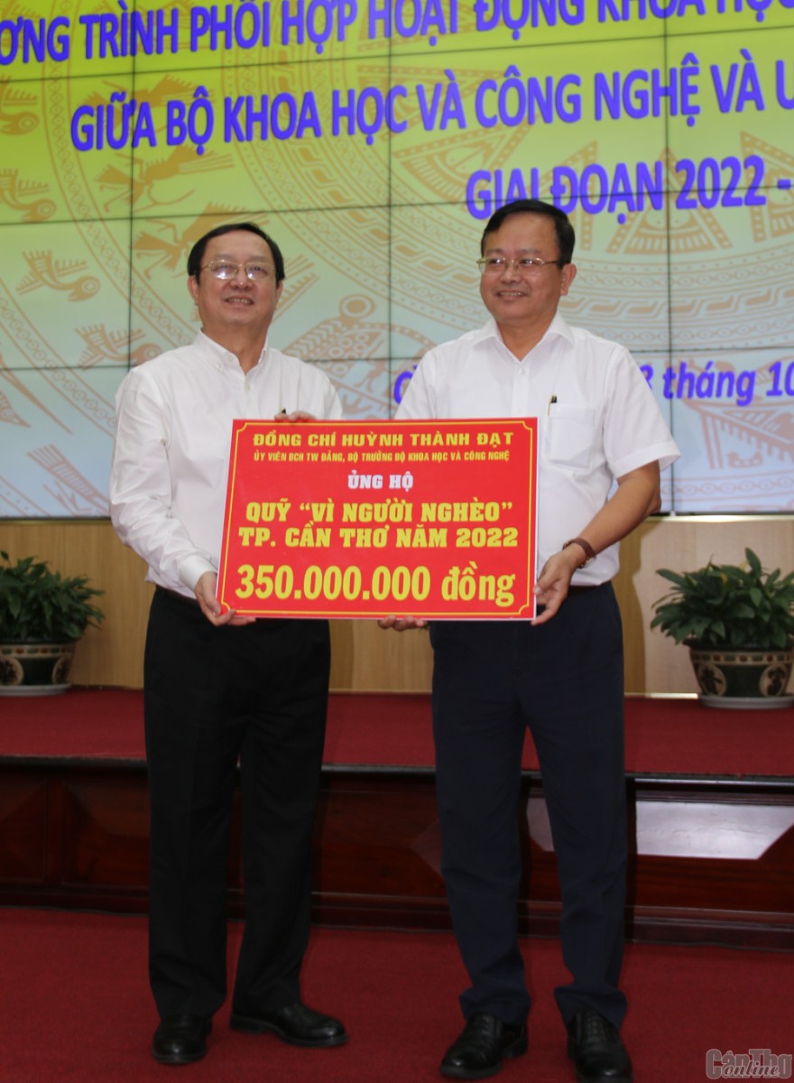Bộ trưởng Huỳnh Thành Đạt cùng ông Trần Việt Trường đã kí kết Chương trình phối hợp hoạt động KH&CN và đổi mới sáng tạo giai đoạn 2022-2025. Chương trình ký kết có 11 nội dung hợp tác, nhằm tăng cường phối hợp giữa 2 bên trong chỉ đạo, điều hành các hoạt động KH&CN, đổi mới sáng tạo; thực hiện thành công các mục tiêu, nhiệm vụ của Chiến lược phát triển KH&CN và đổi mới sáng tạo giai đoạn 2021-2030. Đồng thời, thúc đẩy phát triển nguồn nhân lực chất lượng cao, dịch vụ KH&CN, phục vụ phát triển kinh tế - xã hội của TP Cần Thơ và vùng ĐBSCL; khẳng định vị thế của TP Cần Thơ là trung tâm KH&CN của vùng.