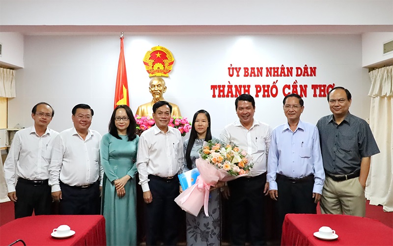 Bà Hoàng Thị Thanh Thủy (thứ 4 từ phải qua) chụp hình lưu niệm cùng lãnh đạo thành phố và Ban Giám đốc Sở Công Thương TP Cần Thơ tại buổi trao quyết định bổ nhiệm.